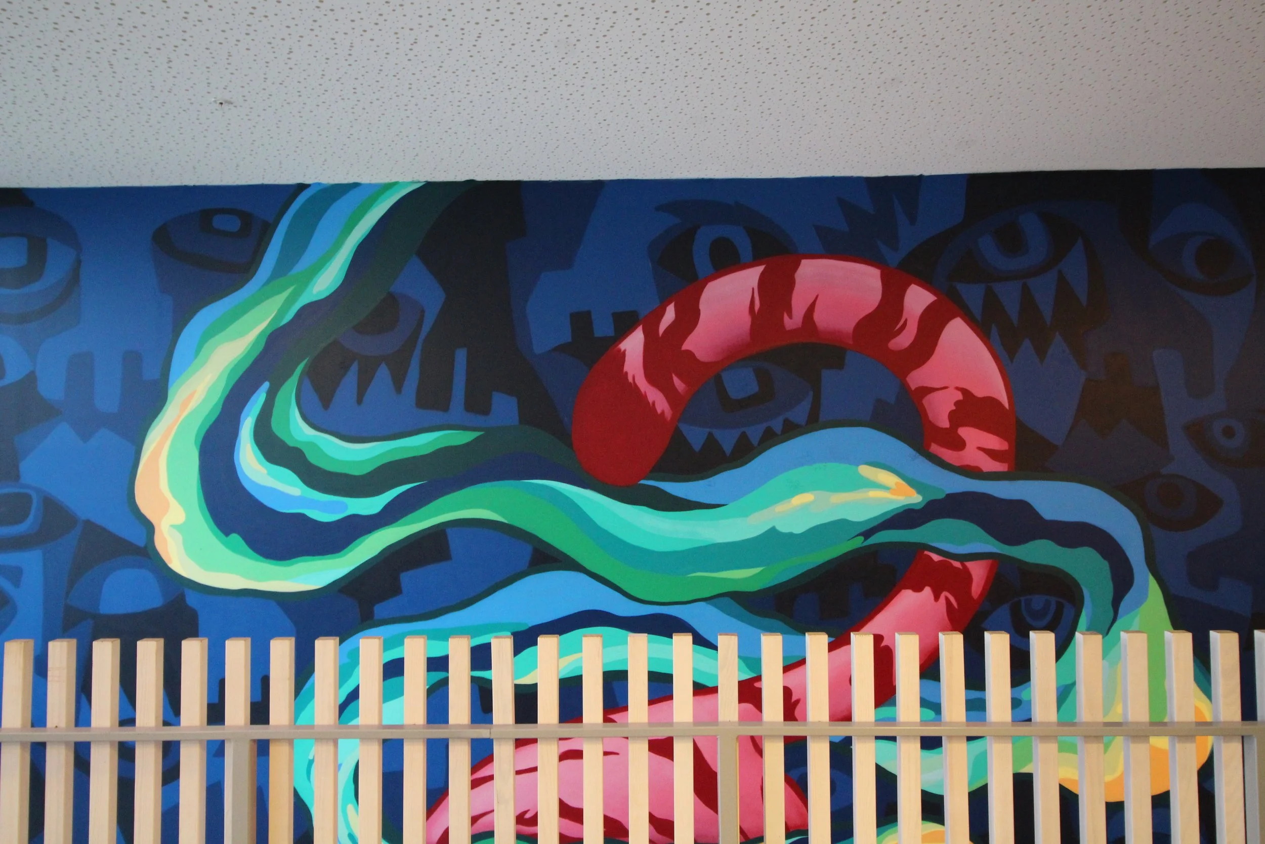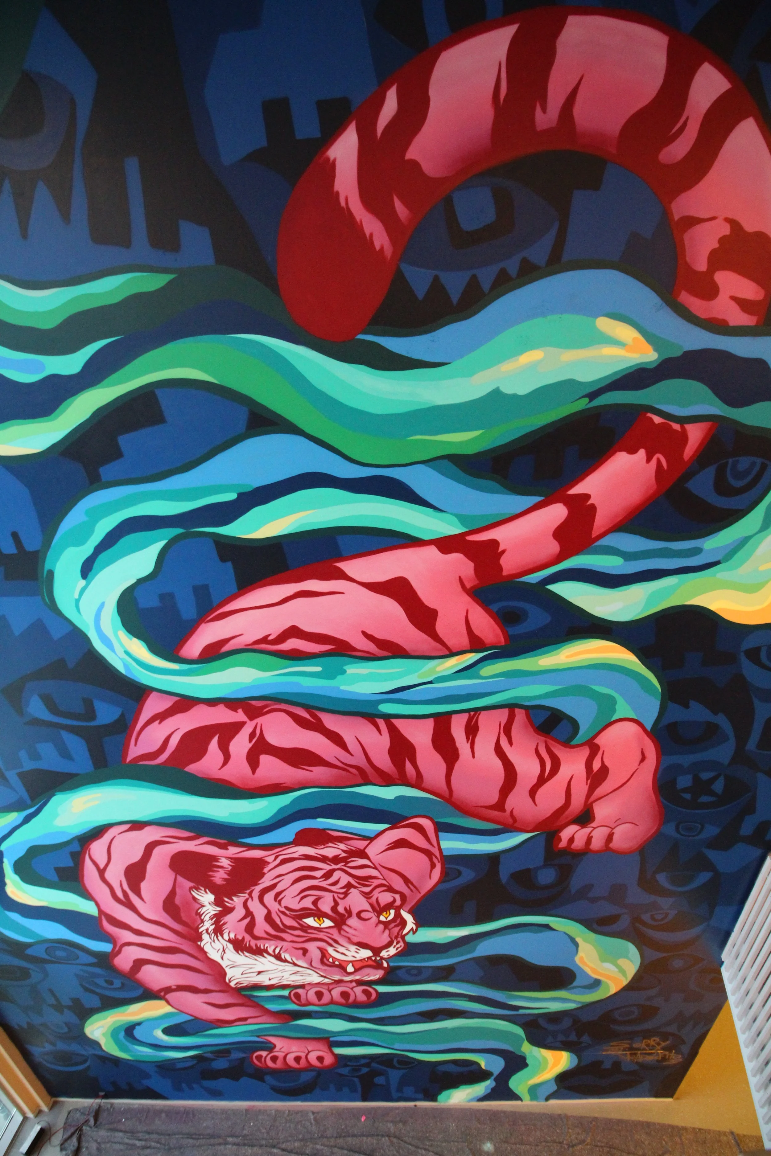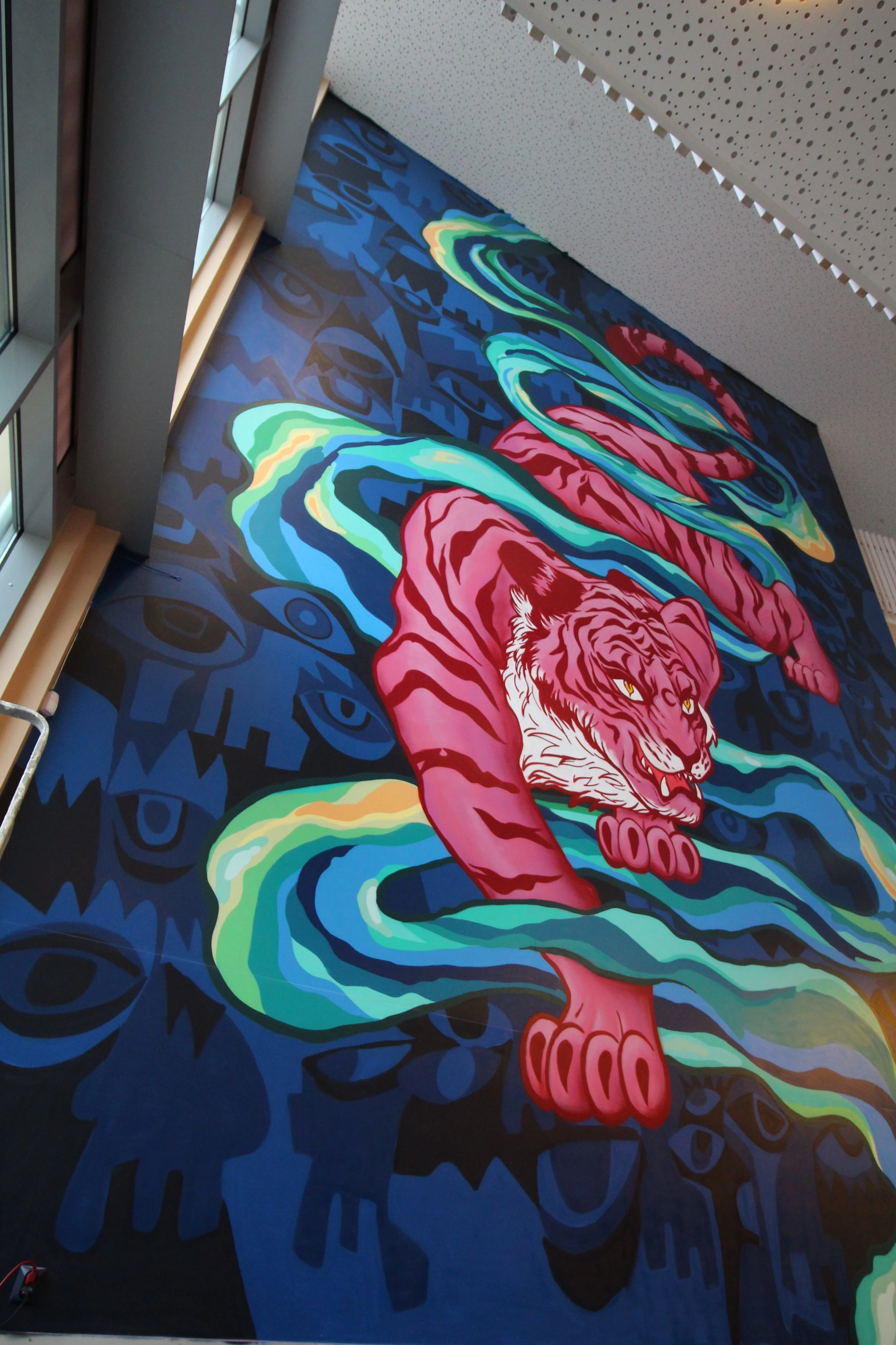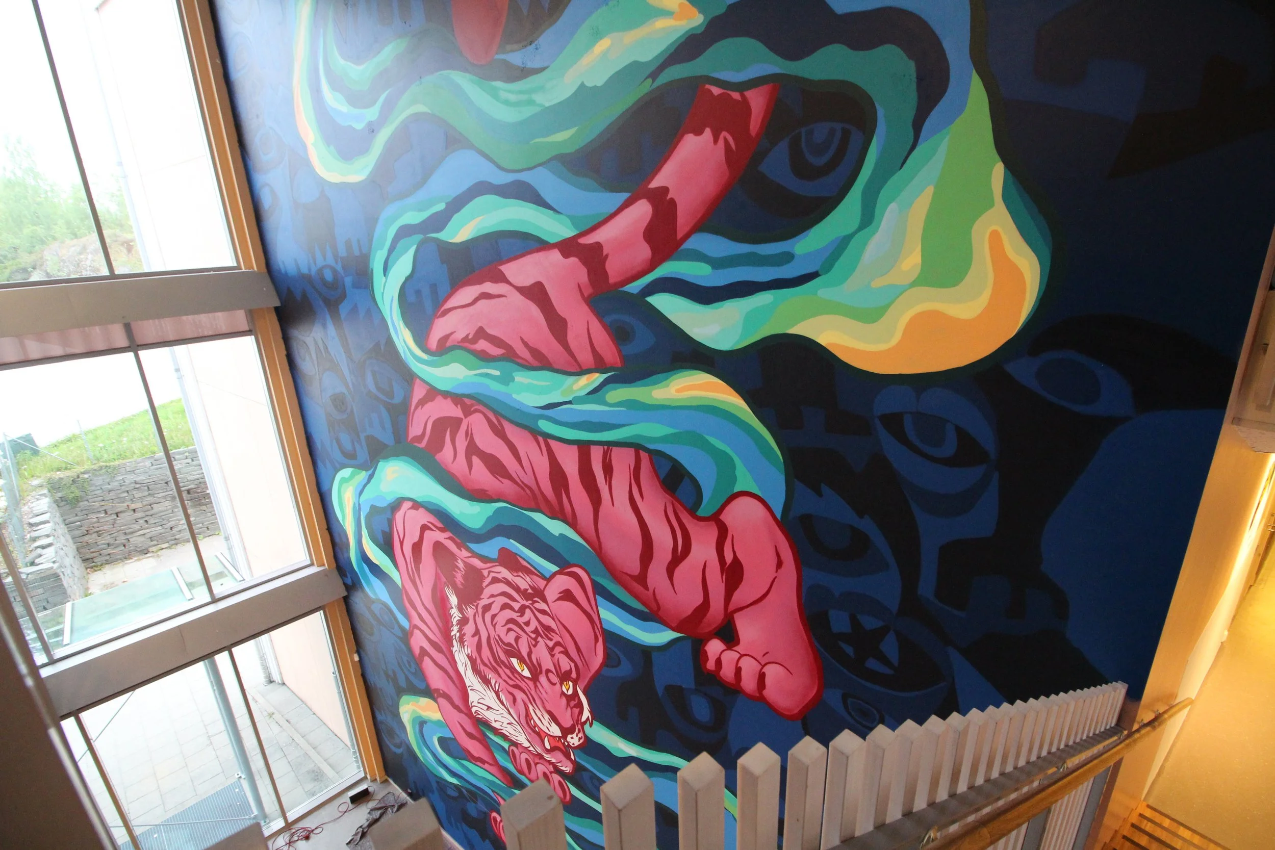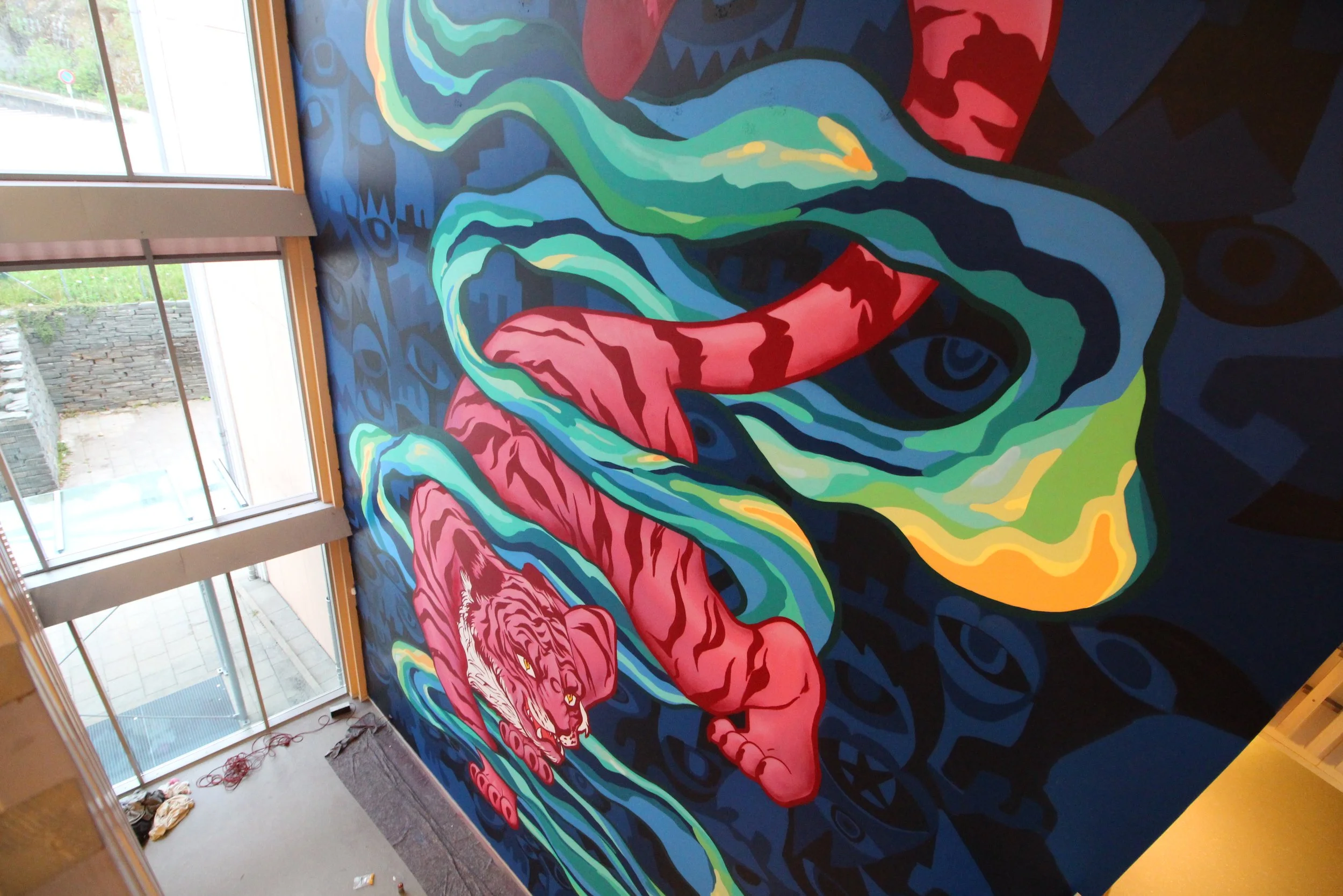 This project won a design competition and became the centerpiece of Kleppestø Secondary School—a school filled with art that brings joy to both young and old. The background was created by Mr. Adolfito, while the design and the tiger were crafted by me.